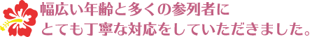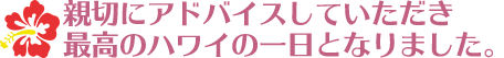 その節はお世話になり、ありがとうございました。ホノルル到着が昼過ぎで、翌日9時の結婚式に衣装が間に合うかが心配でしたが、集中しての小一時間のチョイスにいろいろとアドバイスを頂き、親娘三人の上から下まで揃える事ができました。おかげさまでディナーを安心して楽しむ事が出来ました。