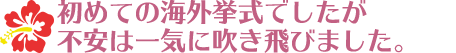 初めてのハワイで不安ながら来店いたしましたが、迎えてくださった方の優しい笑顔と明るくご親切な対応に不安な気持ちも吹き飛び、終始両家で和やかに衣装選びができて、本当に有り難かったです。今も両家で楽しく衣装選びをした時のことが、大切な思い出の一つとして鮮明に残っています。これからハワイで挙式するお友達にも、是非紹介してあげたいと思っています。素敵な思い出をありがとうございました。