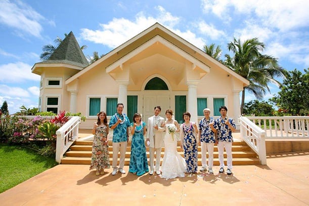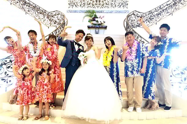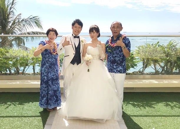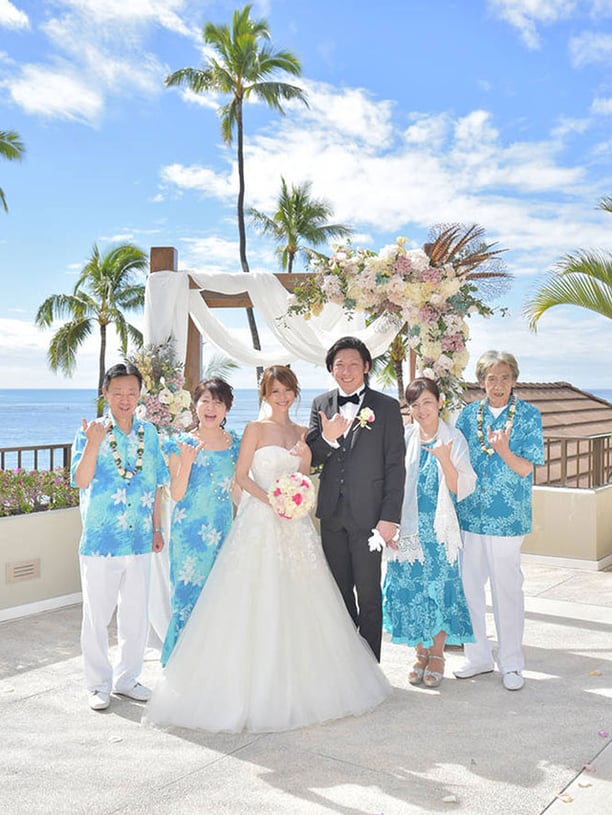 結婚式当日、家族写真を撮っていると、カメラマンさんから「お父さん、お母さん、良いアロハシャツとドレスを着ていらっしゃるのでお二人の写真も撮っておきましょう」と言われました。カメラマンさんは、有名芸能人の結婚式の撮影もされたスタッフとのことで、そのような方から「良いアロハシャツを着ていらっしゃる」と言われて、ちょいとビックリしました。