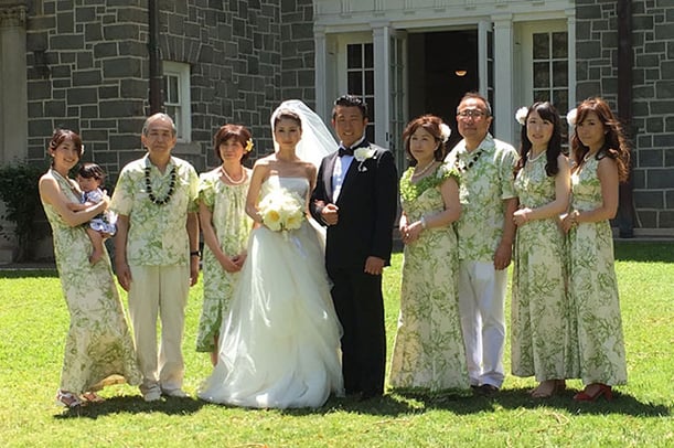 両家の親族の衣装をお願いしましたが、こちらの希望の色のグリーンを用意していただき、ハワイらしい結婚式になり、大変満足しております。WEBで色々と情報をいただき、動画もあり、割とスムーズにお店に行くことが出来ました。こちらのわがままにも優しく応対していただき感謝しております。本当に有難うございました。
